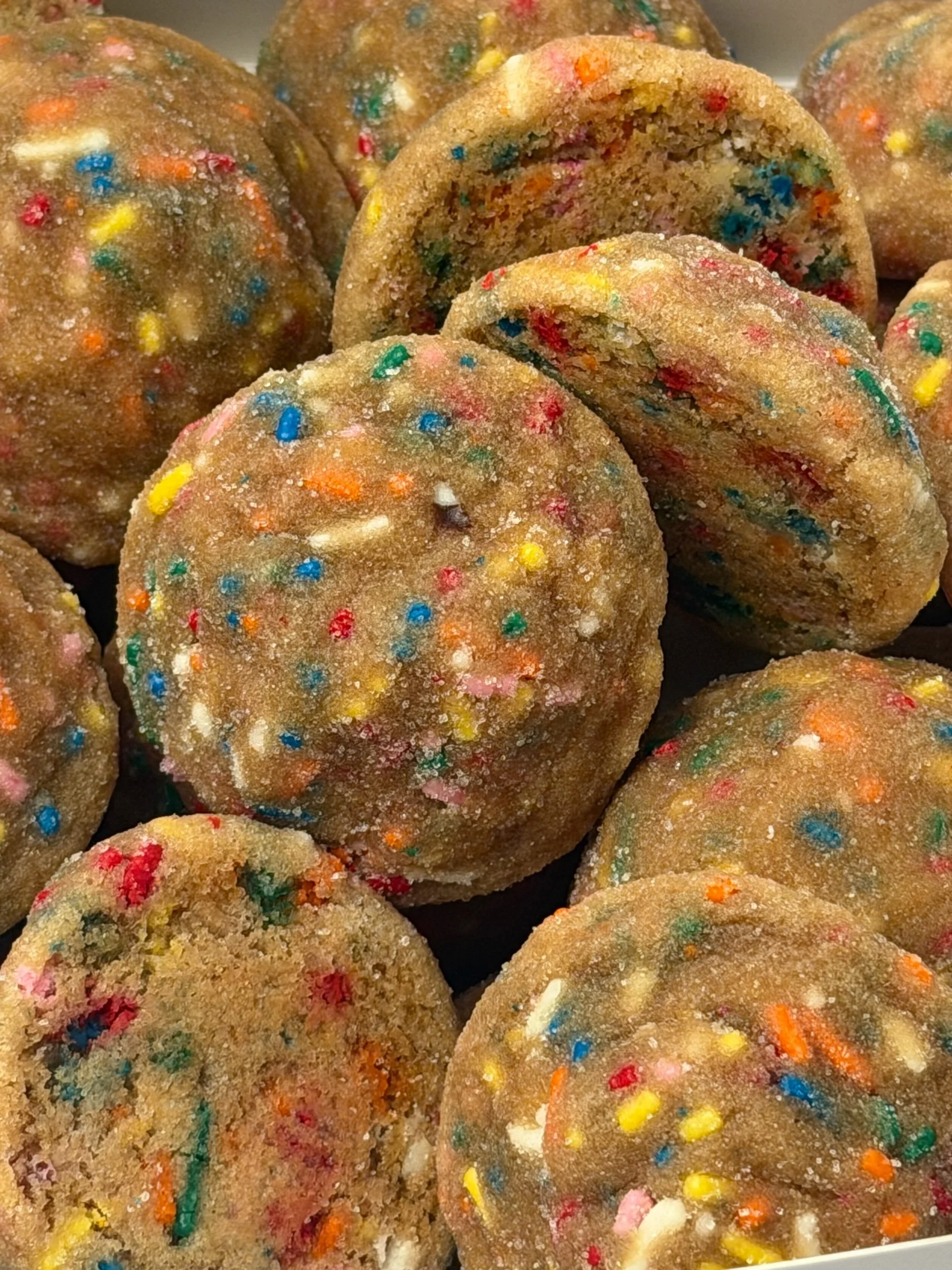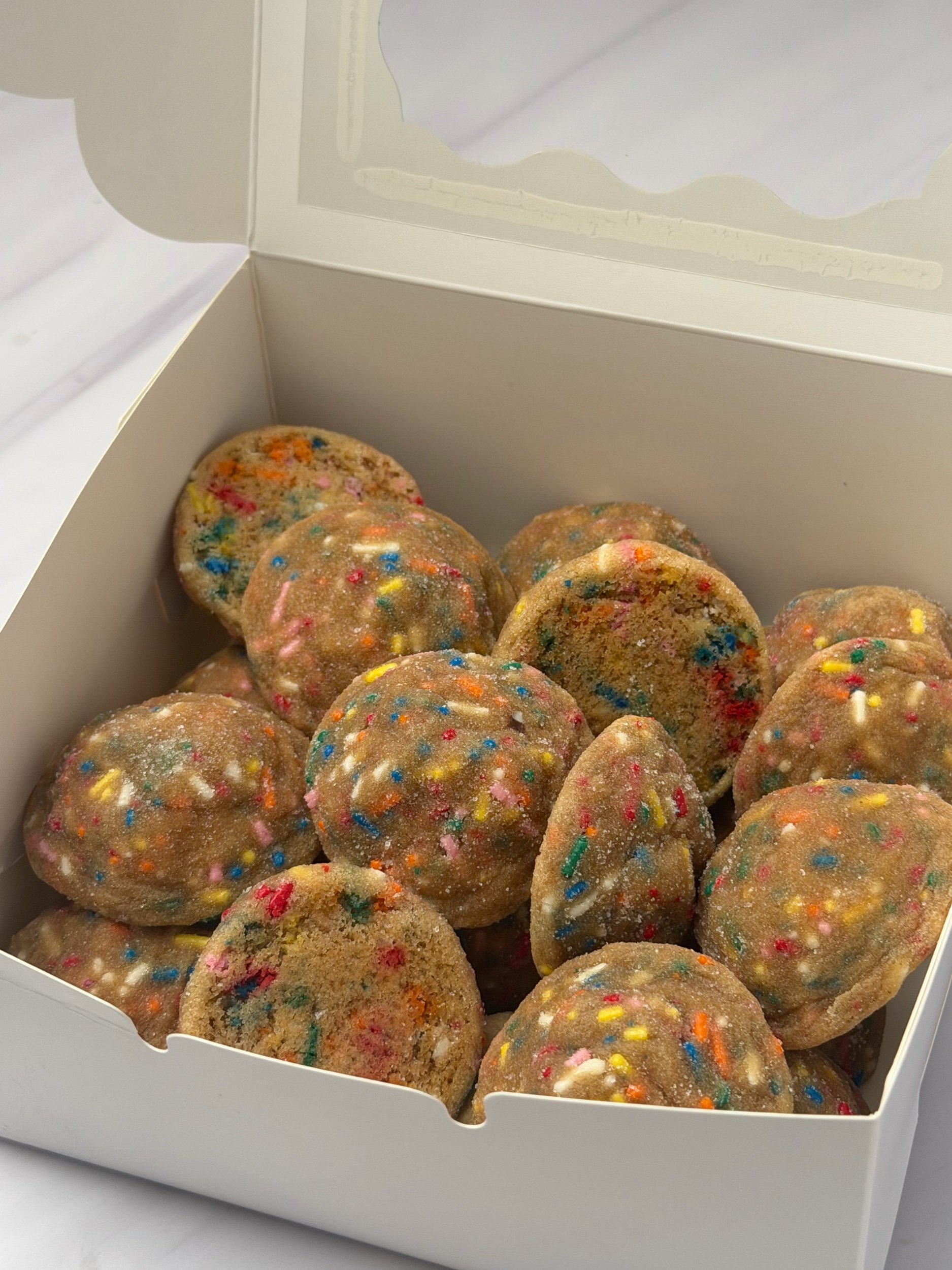 These bite-sized delights are made with nutty, golden brown butter for a deep, rich flavor that melts in your mouth. Soft and chewy with just the right amount of sweetness, each cookie is studded with rainbow sprinkles that add a fun, festive crunch. Every bite is buttery, slightly caramelized, and totally irresistible.